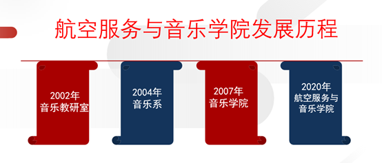 航空服務與音樂學院自2002年以藝術系音樂教研室的形式起步,2004年升級為音樂系,2007年12月獨立建制為音樂學院,并在2020年11月更名為航空服務與音樂學院。學院擁有獨立的教學大樓和音樂廳,配備了多媒體電腦音樂制作教室、合唱合奏教室、數碼鋼琴教室、流行音樂教室、舞蹈排練廳、琴房、空乘實訓教室、民樂排練室、茶藝室等先進的教學場地及設施。