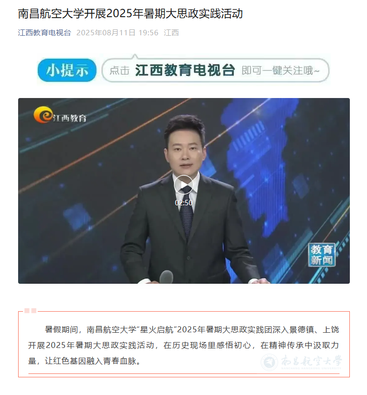 您的位置: 首頁 >新聞中心>媒體南航>詳細內(nèi)容 媒體南航 【江西教育電視臺】南昌航空大學(xué)開展2025年暑期大思政實踐活動 來源: 作者: 攝影: 發(fā)布時間:2025-08-11 瀏覽次數(shù): 次 【字體:小 大】 啟航網(wǎng)訊 8月11日,江西教育電視臺以《南昌航空大學(xué)開展2025年暑期大思政實踐活動》為題報道我校。 媒體鏈接:江西教育電視臺:https://mp.weixin.qq.com/s/b9S2IL6ABcLmLvdS-tfUow 責(zé)任編輯:李政綱 相關(guān)內(nèi)容 【打印正文】