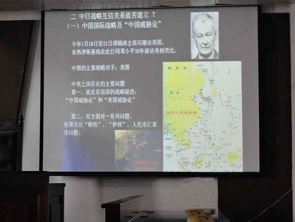 馮教授接著還論述了中日建立友好邦交的可能性,就釣魚(yú)島主權(quán)爭(zhēng)端,臺(tái)灣海峽問(wèn)題分析指出中國(guó)在當(dāng)今世界的主要戰(zhàn)略對(duì)手是美國(guó),美國(guó)的介入成為制約中日建立友好邦交關(guān)系的最大因素。馮教授強(qiáng)調(diào)中日兩國(guó)合則兩利,斗則兩傷,中國(guó)國(guó)民應(yīng)理性的看待中日關(guān)系。