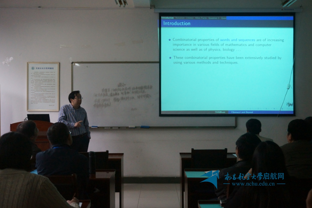 譚波教授從詞上組合和代換動力系統的概念與基本性質出發,詳細介紹了Fibonacci序列、可逆代換序列、Sturmian序列等幾類重要序列的組合性質。譚波教授重點介紹了序列的奇異分解及其應用,闡述了當前的研究進展以及自己最新的研究成果。同時,譚波教授還給出了這一研究課題中一些尚待解決的、重要的公開問題。報告結束后,譚波教授詳細回答了在場師生提出的問題。譚波教授的報告通俗生動,使大家受益匪淺。